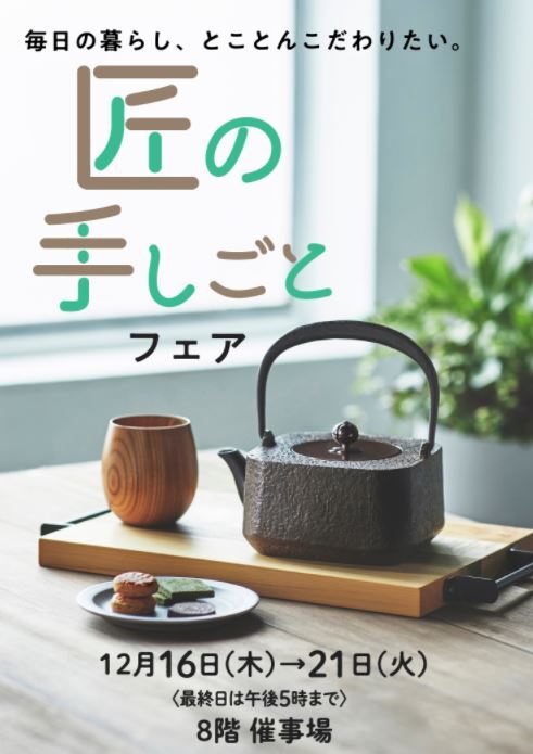 この度、大阪の阪神梅田本店において来週12月16日から開催される『匠の手しごとフェア』に出展することとなりましたので、ご報告致します。