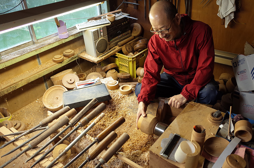 私たち山中漆器の器は、山から木を伐り出す山師(やまし)から始まり、塗師(ぬし)まで、又は装飾を施す場合は蒔絵師(まきえし)までが携わっています。人生をかけて一つの仕事に従事することが多い為、私たちの二代目や荒挽き師の戸田さんをはじめその道60年以上の職人も多く存在し、深い知識や経験に裏打ちされた技術が光ります。私たちの職人頭、二代目章二さんは、寝ても覚めても木のことばかり。うまくいかなかった作業工程の解決策が夢に突然現れ、翌早朝に起きぬけ工場に直行し作業に没頭することなんかもありました。そんな章二さんは木や木地の話をするとキラキラ輝きながら楽しそうに話します。