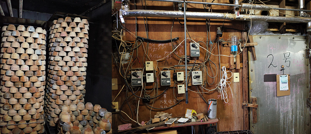 左は乾燥室内の様子。お椀などをタワーのように積み上げ乾燥させます。右はその乾燥室をコントロールするスイッチたち。