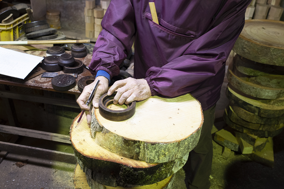 原木から輪切りにされた木に、作る器の大きさに応じて印をつける工程。自然素材である木という素材は、一度切ってしまったら土やガラスのように修正が効かない。そのため夫々の木が持つ年輪や節などの性質を見極める必要がある。この配置によって材料を活かすか、無駄にするかが決まる、経験と知識を要する重要な作業。