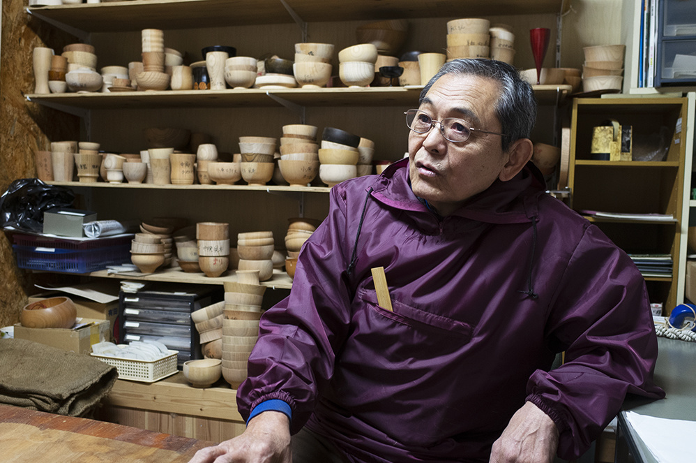 岐阜の市場だよ。岐阜は日本中から一番材木が寄ってくる場所なんやけど、今はものすごく少のうなった。取りやすいところは取ったんで、もう奥の方にしかないってこともあるけどな。切る人がおらんようになったんよ。それで匠頭漆工さんみたいに一度に1000~2000個のまとめた注文をもらうと、市場に行っても出てこんで材料を集めるのが大変。福井の市場は日本で一番有数の欅(けやき)の質が良いのが出るから人気はあるんやけども、毎月3回の市場があったのが段々1回になり、今では2か月に一度になったわ。昨年末は予定されていた市場が木が集まってこんので中止になったんよ。