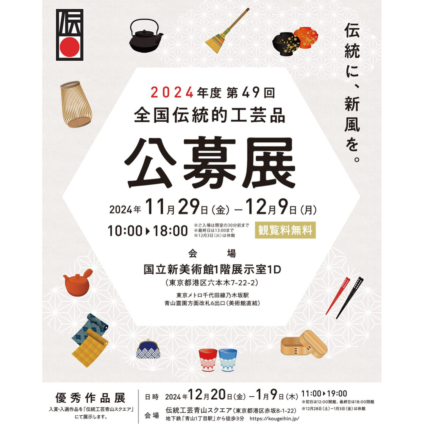 ‘長い間受け継がれた伝統的技術・技法に、現代生活の中で使われるための新しいアイディアや表現を取り入れた、市場性のある伝統的工芸品を公募し、魅力あふれる製品の開拓を行う目的で行います。生活の中で実際に使用または飾ることができ、日常に潤いを与え、暮らしが楽しくなるような作品を募集いたします。国内だけでなく世界のマーケットにも通じ、いつまでも大切に使いたくなる作品をお待ちしております。’(出典:全国伝統的工芸品公募展オフィシャルサイト)